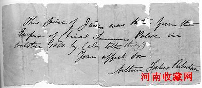 罗伯森写给他母亲的纸条上写着:“这块玉和其他东西都是1860年10月从中国夏宫带出来的。”