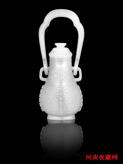 “清乾隆青玉雕仿古兽面纹提梁卣”制作非常精美,卣为古代重要的盛酒器,卣主要流行于商和西周。这件清朝的“提梁卣”为青玉雕成。