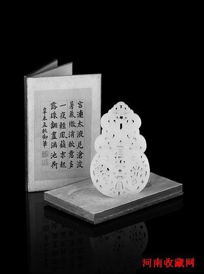 “清嘉庆白玉镂雕凤纹长宜子孙牌”还附有一首唐代王涯的诗词,“宫连太液见苍波 暑气微清秋意多 一夜轻风蘋末起 露珠翻尽满池荷”。