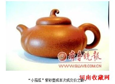 作品“小茄瓜”是一把用黄龙山优质段泥制作的紫砂壶,壶身是瓜的造型,壶盖是茄子把的形象,线条生动、整体饱满。“小茄瓜”起拍价为10万元,报价后2位竞拍者展开了激烈的加价竞争。
