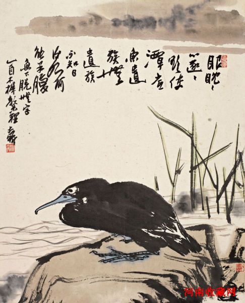 本幅绘江畔鱼鹰伫立石上,耽耽俯视,似待捕食猎物。鱼鹰身体以沉厚的墨笔扫出,几处留白显出尾羽的层次,刚劲的线条勾勒出鹰喙,给人凶猛之感。底部盘石染以淡赭,线条多飞白顿挫,方峻而富力量感,表现出石块的厚度和肌理。远岸横亘,墨韵酣畅。潘天寿作画极重画面之间的呼应,画中远岸、鱼鹰、岩石以至题款皆呈横向之势,几笔水草支立石边,平衡画面布局,给观者留下了神完气足的印象。