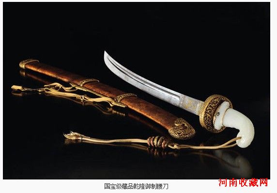 据中国嘉德瓷器工艺品部总经理刘越(微博)先生介绍:“该腰刀是乾隆帝亲自监督、造办处耗时四十七年倾力打造的九十把御制腰刀之一,这九十把腰刀以“天、地、人”三字编号,每字号各三十把,这些宝刀象征着皇帝权力和威势,这九十把腰刀,除少量的外拨和流失海外,绝大部分现仍收藏在北京故宫(微博)博物院。这也是目前所知民间仅存的清乾隆制腰刀。整刀呈细长的‘S’型,刃锋至尖处略上翘,配白玉雕柄,柄底端以涡旋形作收,正中雕刻一朵六瓣花,花心处钻有一孔,穿带珠饰及流苏的黄色丝绦。刀柄上的刻花装饰具有鲜明的蒙古草原风格。刀銎镀金镂雕,刀靠近銎处有金、银、铜丝镶嵌的花饰及云龙纹,另有金银丝装饰框内嵌刻此刀富有诗意的名字——‘宝腾’以及此刀的皇家御制编号——‘天字十七号’,另一侧相同位置则是“乾隆年制”四字款识。刀鞘木制,外包编织纹的桃皮装饰,镀金镂雕襻穿黄色挂绳。材料珍贵,做工考究,含义深邃,艺术价值和历史价值并重,代表了‘康乾盛世’宫廷御造的最高水准。”