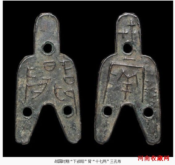 2012秋北京诚轩由海外征集一枚战国时期“下邲阳”背“十七•两”大型三孔币,文字清晰,边廓整齐,品相完美,通体老坑传世古色,为先秦货币中著名珍品。此币由清嘉道间金石学家张廷济、近代收藏家张叔驯递藏,拓本见载于几乎所有古钱币重要著作,极为珍稀。