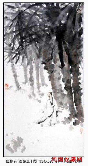 傅抱石是写意高手,他用线用笔意到即止,潇洒俊逸,大气磅礴。此件《蕉荫高士图》应为傅抱石在新中国成立后的作品,无论人物,还是画面的完整性都与其他类作品不同。作者在抗战时期,感于国势时艰,世事的沉浮坎坷,时局的动荡不安,心中的愤懑愁绪,多数作品都是表达傅抱石于纷乱的时局紧张生活之中,祈求和平之愿望,所以此件作品中人物的那种悠然自得、芭蕉的直立挺拔,都无不与作者当时的心情有着极大的关系,画面仍是古意浓郁,颇具六朝人物画之风范,元气淋漓。其构图大胆、简练,他笔下的人物不是现实生活中的原型,仍是表现诗词歌赋中气节高尚、情操古逸、性情潇洒的文人逸士。他善于用深厚的传统人物手法描绘出了人们心目中的屈原、李白、东晋名流等,均皆神情毕现、气质非凡。也许是他深谙“以形写神”之理,认为“传神”才是人物画的最终目的,以至于他所描绘的一系列人物无不以传神之至,使人览之而不能忘且叹为观止。尽管没有题款,但确是一件精品。