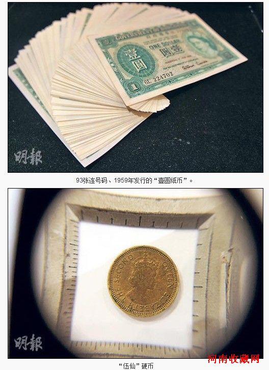 有拍卖行将于本周六举行“钱币邮品怀旧收藏”专题拍卖会,推出逾千项拍品,其中一项为93张连号码、1959年发行的香港“壹圆纸币”,属香港“最后的一蚊纸币”,因当时白银价格飞升,港府曾于1935起以壹圆纸币取代银币为流通货币,但在1959年后已无壹圆纸币发行。