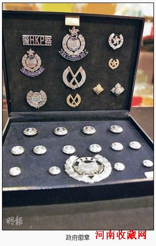 今次亦拍卖多项回归前后的政府徽章,包括一枚俗称“功牌”的皇家警察殖民地警察长期服务奖章,和一整套97后的警察帽徽及阶级章,两者料可叫价至千元;另有一套前市政局卫生督察的帽徽及皇冠衫钮,底价300元。