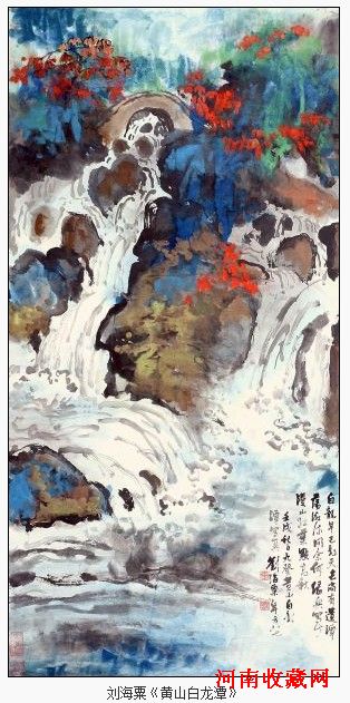 刘海粟的作品往往给人以天马行空的感觉,夸张的用色以及笔墨让人过目不忘。而远观又极其生动极具层次感,正是这种开拓的创作精神,独特的艺术形式,以及生动的作品内容使之成为了近现代中国美术史中不可或缺的艺术大师。刘海粟一生最爱黄山,一生最重要的作品也多以黄山为题材,可以说黄山是海粟艺术的源泉,海粟给黄山增添了艺术内涵。从1918年第一次跋涉黄山到1988年第十次登临黄岳,跨度达70年之久,几乎包括了刘海粟一生的艺术实践活动。单就70年来十上黄山的壮举,就破了历代画家的登临纪录。而他以黄山为题材创作的作品,包括速写、素描、油画、国画,总量蔚为壮观。他在十次登临中体现出来的不断攀援、不断超越的品格精神,更可令人敬佩,引作启迪。1982年刘海粟九上黄山,创作了大量的国画作品,艺术上进一步提升,可谓"渐老渐熟,愈老愈熟"。此件黄山白龙潭正是创作于他九上黄山写生的期间,画中题"年方八七"正写出了海粟不服老的精神,表示自己还年轻,正好用功。作者以欢快的用笔给画面中的水流山花巨石赋予了生命力,观者仿佛能听到潺潺的水声,闻到阵阵的芬芳,这正是一件优秀艺术品所散发。