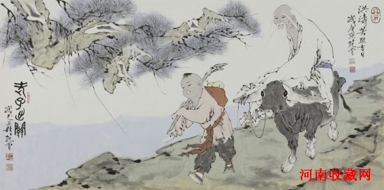 《老子出关》这幅画就截取了这样的场景:函谷关外,盛夏夕阳中暑气渐消,光华东射,正照在关下稀落行人。一位骑着青牛的鹤发童颜的老翁,头戴斗笠,白发如雪,其眉垂鬓,其耳垂肩,其须垂膝,神采奕奕,红颜素袍,正气浩然。身旁牵牛执蹬的小童,在落日渐晚的凉爽风中,兴致高昂,步履矫健。肩后竹竿上,酒葫芦的红布穗儿一飘一荡。那通灵的瑞兽有节奏地踏步缓行。见过倒骑毛驴的张果老,怡然自得,悠悠然。今日见此位老者,却恬淡从容,别有一番忧国忧民韬光养晦的风范。作品中的线条犀利挺拔,作品中的用墨用色大胆准确,表现了清新淡雅之风采。从这件作品中不难看出范曾的大家气象。