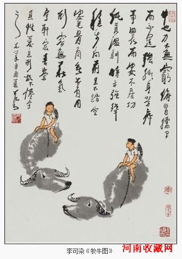李可染的牧牛图取材于南方乡村,表现了水乡独有的美丽景致。先生画牛,墨法明净浑厚,生动地呈现出牛在水中的舒适与自在。牛角用白描的手法表现出牛眼与牛鼻的描写敦厚可爱。可染先前极其爱牛,虽然在他之前已经有很多大家画过这一日常生活中的形象,像唐代的戴嵩,宋代的李迪、李嵩,明代的郭诩,清代的高其佩、任伯年,近代的齐白石、徐悲鸿等等,但是从没有人像他一样与水牛如此朝夕相处过。耕地、吃草、喘气、啃蹄、蹭痒,在下笔前都仿佛是历历在目,得之心而用之笔。卧笔皴擦,勾勒点染,言简意赅却又生动传神。而水牛勤劳朴实的性格也深深打动了李可染,因而我们在画上方看到先生洋洋洒洒的溢美之词:“牛,力大无穷,俯首孺子而不逞强,终身劳瘁,事农而安,不居功,性情温顾,时而倔犟,稳步向前,足不踏空,形容无华,气宇轩宏,吾崇以其**其形,故屡屡不厌写也”。并且在款下方、画右上角与右下角有先生郑重其事的共计四枚钤印,可染,师牛堂,李、孺子牛、陈言物去。早在六十多年前老舍先生还在世的时候,就因为得可染先生一幅水牛而满心欢喜,他说:“在五年前,文艺协会义卖会员们的书画,可染兄画了一幅水牛,一幅山水,交给我。这两张我自己买下了。而那幅水牛今天还在我的书斋兼客厅兼卧室里悬挂着,我极爱那几笔抹成的牛啊!”如今将近七十年过去了,昔日老舍先生厅堂中悬挂的水牛今在何方?我们不知道,我们只看着眼前这幅三十年前的作品,历史与艺术深深荡漾在这里。