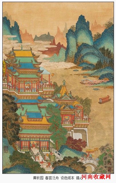 《春宫泛舟图》以界画的形式描绘了春天宫苑中的一角。从布局而论,上承宋人,采取以大观小的传统方法,使画面各宫殿楼阁的透视由散点透视统一起来,更便于表现各处景观,实在巧妙之极。在笔墨技巧上继承明代画家严禁整饬的画风,岩峦树木,描绘得精细慎密,在画面上方的远山峰岭以写意法画出,转折搭连,高低参差,设色多变,而层次分明。另,山石的描绘则以黄秋园自己独创的充满神秘感的“骷髅皴”为之,设青绿色,用笔精到老练,动得神似,笔群超逸,极具个人的面貌。画中的宫殿楼台、飞檐斗拱,建构精确,宏大雄肆,富丽精工,一丝不苟,彰显其界画独树一帜的功力;画中人物非神非仙,又似神似仙,祥云飞饶,飘飘欲举,各有姿态,大抵见春游之萧然闲逸。江中舟船飘荡,嫔妃悠闲自在,尽赏美景,一笔一画皆细密工整,令人惊叹!画上所配树木奇石、山水舟船、水纹云彩衬托整体宫殿之富丽堂皇,好一幅春宫赏景的山水画面,这即是艺术家心中的极乐仙境,也是人们对美好生活的向往。此乃黄秋园先生极具现代之审美理念的界画山水代表作之一。