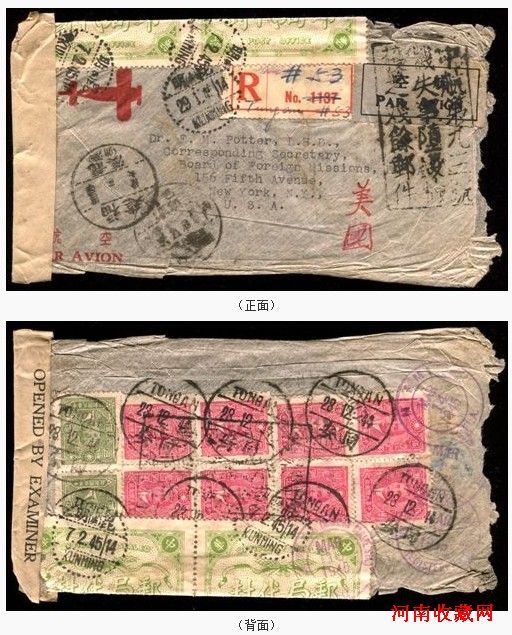 这是一封自1944年12月23日由福建省同安县寄往美国纽约的西式航空挂号实寄封,收件人是纽约的美国公理会差会秘书Potter博士,寄件人则不详。而此时正值“豫湘桂”战役胶着的时刻,湘、桂、粤三省占当时大后方工业的1/3的工厂尽丧敌手,东部沿海省份中的36个机场、7个空军基地、146个城市等共计20余万平方公里的土地也都相继沦陷。同时湖南、广西、江西、福建、广东等多省邮路被迫中断,汉粤铁路、湘桂铁路也完全被日军封锁,东部沿海沦陷区和西南大后方往来的邮件只能通过湖南邮工创建的步班秘密军邮邮路中转。战役中,军邮随军情变化,与普邮取得联系,共同维持着邮运的畅通①。
