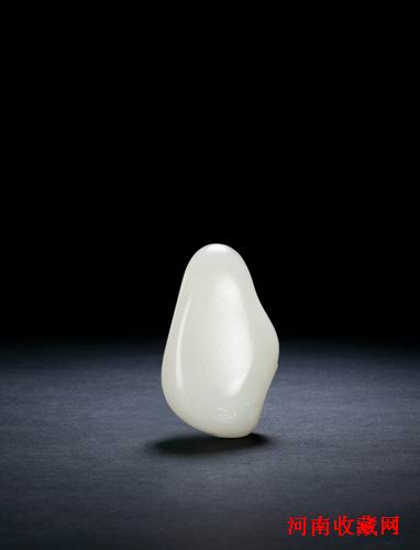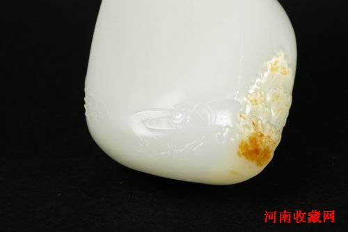 羊脂白玉是和田玉中的宝石级材料,是白玉中质纯色白的极品,具备最佳光泽和质地,表现为温润坚密、洁白无瑕、如同凝脂,故得此名。羊脂白不是纯白,而是带有油脂光泽的白。此把件用料白润细腻,并带有黄艳的皮色,在白润玉质的映衬之下,更增加了该把件的富贵之气。而玉料缺口处则抛光精润,以大拇指触之,则手感极佳,增强了把玩时的舒适性。