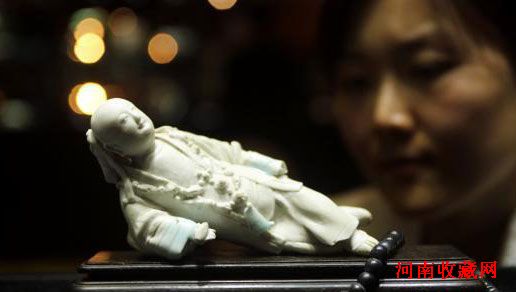 图为元代湖田窑青白釉涩胎“睡梦童子”造像亮相。中新社发 赵隽 摄
