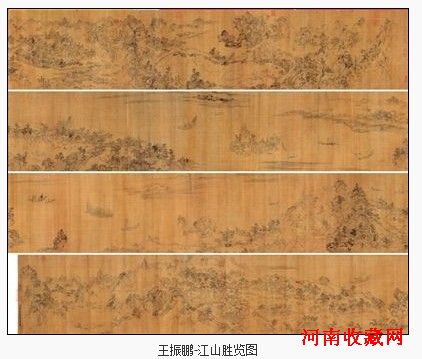 王振鹏是元代著名的宫廷画家,擅长佛教和山水题材。他创作的绢本水墨手卷《江山胜览图》描绘了元代浙南瓯江沿线的生活场景。画面长9.5米,共描绘1607个人物、494幢建筑、68艘船只、108头牲畜、87只鸟,详实反映了元代江南地区人民娱乐、买卖、婚嫁等各种生活场景,是一件堪与北宋张择端《清明上河图》媲美的纪实性风情画长卷。该画作历经明朝钦天监和清朝宫廷收藏,著录于《石渠宝笈续编》和《石渠随笔》卷四,后经比利时收藏家尤伦斯夫妇收藏,具有极高的艺术价值和史料价值。