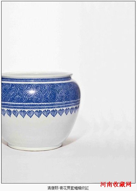 “瓷器工艺品”专场中“清康熙青花贯套蟠螭纹缸”是重中之重。此缸造型硕大,却形制规整,毫不变形,体现了康熙时期高超的制瓷水准。本品另个特色在于其所绘纹样,仅于颈肩之处以青花环绘蟠螭纹饰带一周,其下点缀三角蝉纹,下腹部则全部留白。这种艺术表现方式是康熙御窑有别于后代的一个重要特色,即纹饰布局的不对称性,将主题纹饰集中绘于器身一处,其余处以留白手法进行衬托,康熙晚期御窑名品青花或釉里红摇铃尊即为此类手法之一例,与本品相比,二者虽大小有别,但纹饰布局、纹样选材上均有异曲同工之妙,其烧造年代或相距不远。故宫[微博]博物院收藏有与本品纹饰完全一样,但大小有异的藏品,说明此类作品在当时曾制作有多个型号,按其大小分别有不同之用。