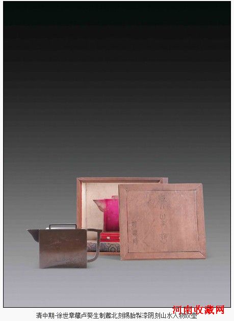 在这一批北京私人藏品之中,最为值得一提的当属本次“掌玩心悦”专场的封面“徐世章藏卢葵生制歗北刻锡胎髹漆阴刻高士泛舟图壶”。本品长方造型,以锡为胎,外髹漆,做工简洁而精致,两面浅刻纹饰,一面为高士泛舟于江上,一面为高士论道于山间,纹饰刻划极浅,刀法灵动自然,不尚繁缛技法,单以空灵之意境取胜。卢葵生(约1775—1850),名栋,扬州人,活跃于嘉庆至道光年间,技艺继承其祖映之,至葵生技艺更加精湛,青出于蓝而胜于蓝,为嘉、道年间之漆艺大师。本壶另一珍贵之处在于其楠木包装刻款说明此壶曾为民国时期天津著名收藏家徐世章旧藏。徐世章(1889—1954),天津人,民国总统徐世昌堂弟,曾任交通部次长等职,一生热衷收藏,尤精于砚台、玉器。晚年他将自己耗尽一生心血所藏的近3000件文物全部无偿捐献给国家,其中砚台、玉器构成了天津市艺术博物馆(今天津博物馆)这两项藏品的主体。