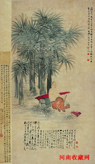 就目前所知,在任伯年为吴昌硕所作画作中,以吴昌硕为题材的仅有8幅,都属于任伯年人物画作的精品。其中,1883年作的《芜青亭长像》现为浙江安吉县博物馆藏。在1886到1888年间,任伯年以吴昌硕本人为题材的绘画中,包括了这幅《棕阴纳凉图》及现藏于浙江博物馆的《酸寒尉像》和《蕉荫纳凉图》。《棕阴纳凉图》为1887年所作,由吴昌硕后人呈拍,是首度在市场中亮相的任伯年画吴昌硕小像题材作品。同时,也是这几幅作品中唯一为吴昌硕家属珍藏,并含吴昌硕自题签条的一件。画此画时,任伯年48岁,吴昌硕44岁。画面上,一大片棕榈为背景,浓淡墨勾染并施,棕榈树下,昌硕先生倚书与朱琴,赤膊席地而坐,神情自若。