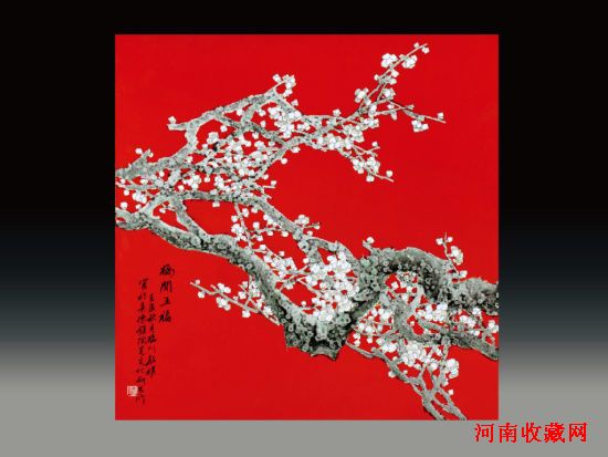 作品以红釉衬托白梅,观之艳丽悦目,却鲜而不火、丽而不俗、重而不闷。梅花圈点而成,枝桠虬劲斜出,以笔势取气,以釉色取韵,可谓其形可视,其香可闻,颇有“疏影横斜水清浅,暗香浮动月黄昏”的意味。