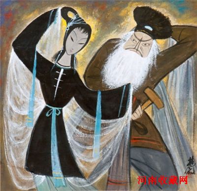 林风眠先生于1951年移居上海,经常欣赏京剧、越剧,戏曲人物便成为林风眠喜爱的绘画题材之一,并创作了大量戏剧题材作品。这幅《打渔杀家》是画家赠送给时任上海人民美术出版社副总编辑的赵坚先生的。画家曾说:“我喜欢看电影和各种戏剧,不管演得好坏,只要有形象、有动作、有变化,对我总是有趣的。”作品所展现的场景正是渔霸即将上门,父女深夜逃跑那场戏。画家将原本繁复的舞台服装色彩简化为纯粹的色块来代表人物的个性,人物的语言、姿态、神情则借由俐落流动的线条来诠释,背景色彩的变化用来强调舞台上的光影效果,“形象、动作、变化”在静美的画面中成为永恒,先生对真、善、美的追求跃然在目,“戏曲立体主义”跃然在目。