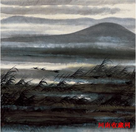 水墨的色彩,最适宜表现雨雾和云烟。《芦雁图》以大量水来调和淡墨晕染山峰,以水彩的方式画水墨,出色地表现了山峰的蜿蜒体态与山雨欲来时的光影变化,成功地突破了墨与光的冲突,将留白作为乌云下透露的曦光、微照下翻滚的水面。风无形,最难画。画家借芦苇、归雁表现劲风,一举多得:浓墨苇丛在风势下倾斜,却根根不弯不折,苇叶如刀;几只大雁前后相随,破风逆飞,疾如利箭。疾风骤雨中的芦与雁是林风眠作品中常见的题材,此幅《芦雁图》作为林氏扛鼎之作曾多次出版并参展。观《芦雁图》,仿佛能听到风声呼啸、苇荡潇潇、雁鸣啾啾,仿佛能感觉到黑云压城的忧郁、白浪翻腾的紧迫、江渚幽草的潮湿,画面所展现的力量感、速度感让欣赏者产生错觉:疾飞的大雁会穿过我们的胸膛和思想!林风眠的作品无疑具有雄浑的力度和宏阔的意境,在感伤中藴涵着勃发的生命力和无限的希望,向世界宣告他的坚忍、孤傲、悲凉、空旷。