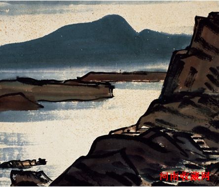 2 0 世纪 3 0 年代中期以后,林风眠开始使用方形构图,尝试拉开与传统习惯的距离,于是那种高远、深远或平远的感受被削弱了,他更多地强调绘画性而淡化叙事性,较多使用西方的焦点透视,进行特写式的近景描绘,给人一种单纯、明朗、果断的视觉效果。而曾由藏学家Albert Tafel家族旧藏的《江边小景》虽是典型的“方纸布阵”,却同时脱胎宋画承袭明家,布局严谨,层次丰富。磐石在山,孤舟在江,澄江如练,洲渚飘零,读之气氛萧索,清秋之气如触肌肤,促人浮想联翩。