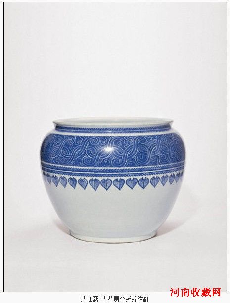 “瓷器工艺品”专场中,“清康熙 青花贯套蟠螭纹缸”拍前即为重中之重,最终138万夺魁。此缸造型硕大,却形制规整,毫不变形,体现了康熙时期高超的制瓷水准。本品另个特色在于其所绘纹样,仅于颈肩之处以青花环绘蟠螭纹饰带一周,其下点缀三角蝉纹,下腹部则全部留白。这种艺术表现方式是康熙御窑有别于后代的一个重要特色,即纹饰布局的不对称性,将主题纹饰集中绘于器身一处,其余处以留白手法进行衬托,康熙晚期御窑名品青花或釉里红摇铃尊即为此类手法之一例,与本品相比,二者虽大小有别,但纹饰布局、纹样选材上均有异曲同工之妙,其烧造年代或相距不远。故宫[微博]博物院收藏有与本品纹饰完全一样,但大小有异的藏品,说明此类作品在当时曾制作有多个型号,按其大小分别有不同之用。
