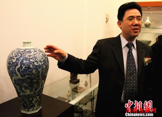 加拿大乐得宝国际拍卖有限公司合伙人袁志强正在介绍拍品:元代景德镇窑青花火焰海水白龙纹八方梅瓶。 赖海隆 摄