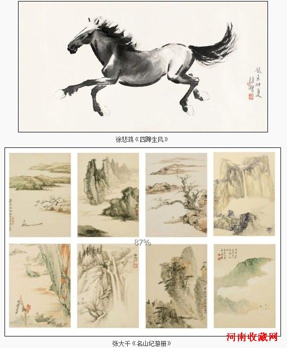 近现代部分,徐悲鸿1943创作的《四蹄生风》集空间感、立体感、真实感于一体,图中骏马奋蹄如飞,意气风发,代表了徐氏大写意画马的高超水平,最终以333.5万元拔得头筹;太乙楼旧藏张大千《名山纪游册》为1938年道经香港旅次所写,赋色清丽,意境悠远,299万成交位居第二;黎雄才《松间明月》、李可染《杏花春雨江南》皆276万拍出,天津人美旧藏齐白石《蜻蜓南瓜》与海派大师吴昌硕《老松眠云》亦均以264.5万落槌,此外,本场齐白石、黄胄、王雪涛、陆俨少、黄宾虹、关山月等南北名家精品,由于著录翔实,来源可靠,亦有不俗表现,限于篇幅,兹不赘述。