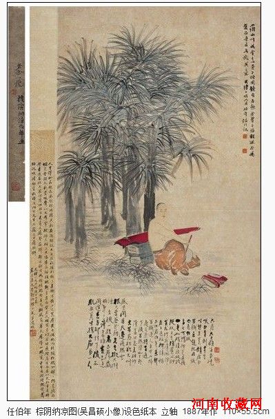 这张《棕阴纳凉图》,其实颇可以与后此一年的《蕉阴纳凉图》合而观之,再加上之间(时间上正好也在两作之间)的《酸寒尉像》,任伯年艺术成熟时期在“变法”上的融会贯通与自由自在,正可以一览无余。《棕阴纳凉》写景以意画人以工,笔张墨驰,神韵怡然;《蕉阴纳凉》景物虽与前者有异同,在人物形象和寓意上其实是再次表达了画中人(即吴昌硕)隐逸萧散的“道情”,但却被尽数收入工致紧张的线条之中,设色腴丽,俗情雅意冶于一炉;而《酸寒尉像》,则完全以墨骨法大块晕染,厚积薄发,重笔轻举,将吴昌硕斯时心灰意冷于宦情仕途的局促生涯在身姿与情态两处表现得淋漓尽致。这画风上的一转,再转,三转,一年前后,居然可以如此自由适宜、收放自如,而又都俱得其情,在并世画家中,恐怕仅见于这位成熟时期的小楼先生。