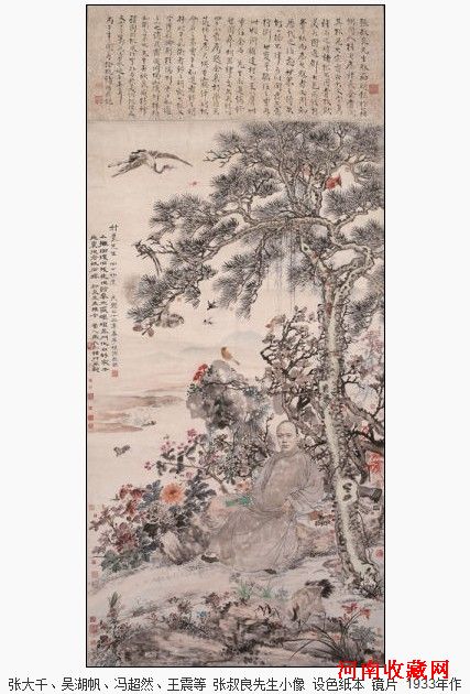 一幅《张叔良先生小像》将亮相今年岁末西泠印社[微博]秋季拍卖会。此为人物花鸟集锦之作,由数十位名家政要合写并题,包括了海派重要名家张大千、吴湖帆、时年85高龄的王震(一亭)、冯超然,吴征、僧陀、陆抑非、以及沪上书画社团活动领导人马骀,海上名家程璋、沈广、丁宝书、陈摩、诸闻韵、洪畿,画家王廷珏、颜元、顾伯达、柳君然、朱守一、张星阶、孔小瑜、俞寄凡、熊松泉、顾岩、张石园、向镛、马万里、唐熊、樊浩霖、女画家吴青霞、江亚南等数十位当时上海中国画院画师、上海文史馆馆员、西泠印社社员,更有国民党四大元老之一张人杰、国民党中央政治会议主席胡汉民、时任国民政府委员兼考试院院长戴传贤,以及退出政坛隐居编纂《吴县志》的大收藏家李根源,时为全国收藏之冠的大藏家庞元济,实业家陈小蝶,以及京剧大师梅兰芳、竹刻家盛松、工艺美术大师蔡铣。