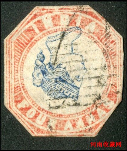 据悉,该枚邮票面值4安那(annas,当时印度等国的辅币单位),属全球首批彩色印刷邮票之一。同款邮票以每版12枚印刷,当时共发行逾20.6万枚,但错体邮票只有3版,即36枚。