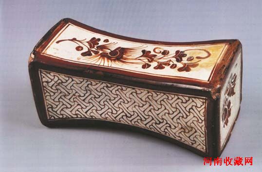 此瓷枕为锭形,中空,两端近似正方,向中部枕面弧形凹下,一端四角有立烧支点,另一端有直径0.5厘米的圆孔;牙白色胎质,在乳白色釉质底色上,绘以棕褐色菊花形等图案纹饰,两端各绘花卉一朵;枕之四面中两面绘带叶菊花,另两面一面在菱形格内分别填以菊花一朵,另一面绘工形几何形图案。此枕长23厘米,宽11厘米,高11.3厘米,中腰8厘米(见图);整体造型秀美,所绘菊花,笔法流畅,形象逼真,纹饰格局得当,主题突出。