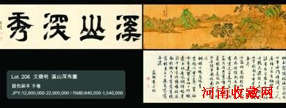 东京中央公司表示,日本人收藏中国艺术品可以追溯到唐宋时期,公司就是想在日本发掘出更多被深藏的中国艺术精品,回到中国收藏家的手中。本次春拍,东京中央又挖到了大量精品,其中不乏有故事的佳作。比如,《文徵明、沈周书画合卷》,为沈周水墨淡彩山水画与文徵明诗书合卷,文徵明的诗书完成于他86岁时,而其老师沈周的山水画创作于50多年前,文徵明创作诗书时,沈周已离世很久了。沈周所画的,是当年他们师徒同游的苏州支硎山,沈周此作,一直收藏于弟子文徵明之手,直到文徵明晚年,才制作合成卷,成就了一曲高山流水。