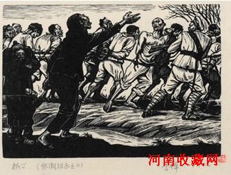 “烽火年代”战争时期作品专题再次成为“滴泉集珍——中国现当代版画专场”的学术亮点,更具收藏价值。作品大都创作于上世纪的三四十年代。此专题汇聚的名家有:李桦、古元、力群、邹雅、章西厓、黎鲁、张漾兮、赵延年、王麦秆、王树艺、乌叔养、杨纳维等,其中李桦创作于上世纪四十年代的版画《怒潮》,此组作品在中国现当代美术史相关书籍中著录无数,是李桦最为代表作之一。此幅《抓丁》是此组画作品之一,表现了当时国民党反动派大肆抓丁为打内战搜罗炮灰的情景。壮丁们被捆绑着,痛苦挣扎,妻子儿女呼天号地,画面造型严谨,人物形象典型,刀法刚劲有力,气魄宏伟。具有感人的战斗力和时代精神,是中国现代美术史上不朽的代表作之一。