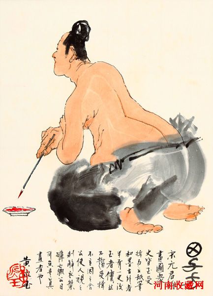 那么田子方到底是个怎样有趣的故事呢?这事发生在春秋战国时期,相传宋元君命众人作画,画师们都恭恭敬敬立在外面完成作品,只有一人径自回到家里,脱下外套随意坐下,尽情挥毫泼墨。宋元君知晓此事后,认为此人是真正的画家。黄永玉还画过一幅画来表现这桩趣闻。而这幅作品即将在上海道明18届联谊拍卖会上拍。