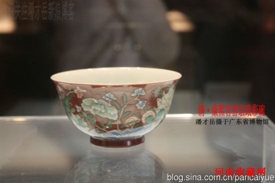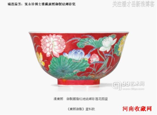 由于珐琅彩瓷的生产成本极其昂贵,在古时的生产数量不多,存世量极少等因素。从99艺术网中所提供的图录图片中可以看到,本次HK佳士得春拍的这件珐琅彩碗内为素白釉,碗外为红色釉,饰荷叶莲花纹。而广东省博物馆的镇馆之宝的一件同样有一件康熙御制的珐琅彩碗,其底书“康熙御制”四方图章款,为康熙珐琅彩代表作。