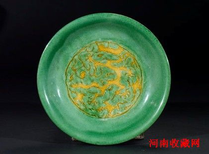 明嘉靖绿釉黄彩暗刻龙纹盘
