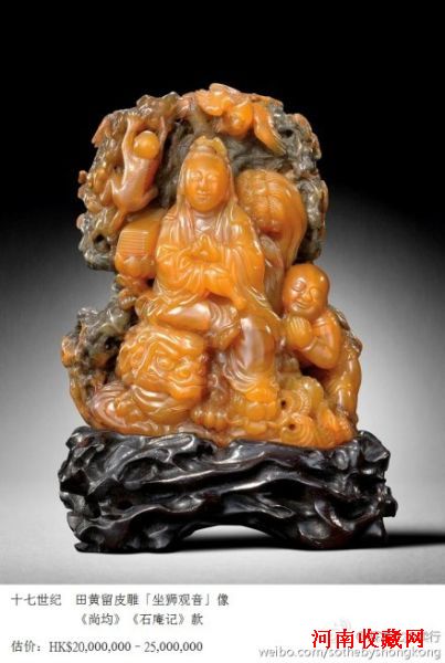 而苏富比[微博]今春的拍卖会中,再度呈献“水松石山房藏珍玩专场──儒雅清蕴(三)”估价为25000000元的田黄精品之清康熙尚均款田黄留皮雕“坐狮观音”像。这件苏富比官方推注释:“周彬,字尚均,乃十七世纪著名雕刻家。据录,周彬雕作中,鲜取田黄为材,故尤为珍贵。此品来源有序,乃清初名臣及书法名家刘墉(1719 - 1805年)于乙卯(1795)年获门士潘生送赠之礼。”