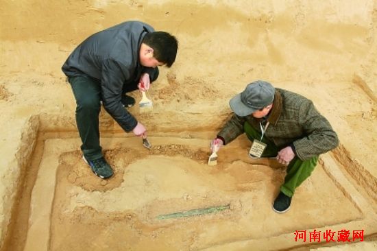 “墓葬群位于新郑市郑韩故城北800米处,由15座古墓葬组成。从墓葬形制及随葬品初步判断,目前已发掘的9座均为战国时期韩国墓葬。”郑州市文物局局长闫铁成介绍说,“此次出土文物中,有一把青铜剑特别引人注目。该剑长半米,保存十分完整。虽深埋2000多年,刀刃依然很锋利。”