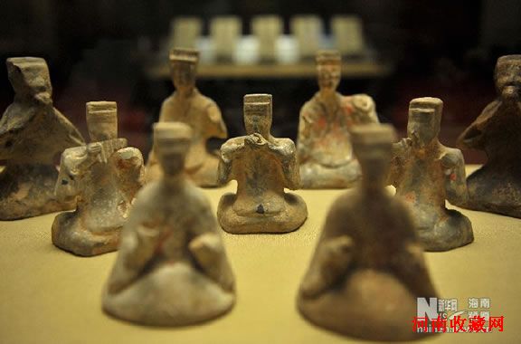 中原古代音乐文物展上展出的汉代乐舞杂技俑