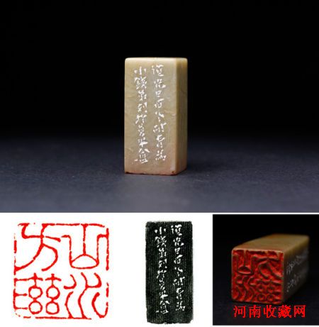 吴熙载刻寿山石“双面自用印”,原为西泠印社早期会员方节厂所藏,这方两面印是旧版《吴让之印谱》之扉页,被收入《中国书画家印鉴款识》,见载于各类印谱、印学类书籍,出版累累。原印并有王福厂的观款,记载佳印递藏之轨迹,可赏可读。吴讓之汲取邓派篆刻精华,“尽弃其学而学之”。其以书入印的创作方法,将秦汉印的古典气质与流派印的浪漫情怀完全融合,书印合一,有盎然的笔意,又有强烈的韵律感。