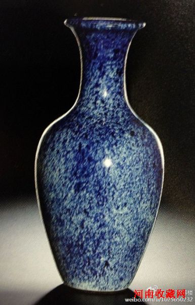 苏富比的拍卖资料是这样介绍此瓶的:此釉色彩独特罕见,又称洒蓝、雪花蓝或青金蓝。于中国多以青金蓝见称,于西方则多称为雪花蓝。釉色斑斓,首见于明代瓷器,传世有不少署宣德款作例。据说是在已烧成而未罩釉的瓷坯胎体上,将混合篮釉吹于器面,然后低温再烧(约摄氏八百至九百度),犹如烧制唐代陶器上的钴蓝釉般。有别于一般明初釉彩,雪花蓝釉色调多样,从天蓝到青金石色,趣意无穷。此釉难以烧成,象征明宣德官窑最富丽华贵及令人惊喜的发展。