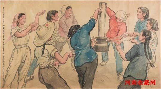 从对九个人物的巧妙安排上可以看出,作者是花费了相当大的精力的。无论是人物的服饰发型,还是她们所呈现的移山填海的豪迈斗志,无不具有鲜明的时代特色。“举得高呀落得重,水坝基础打巩固。鼓足干劲争上游,人民生活穷变富。”听到这激昂顿挫的打夯歌,我们仿佛看到了水库工地上红旗招展,热火朝天的劳动壮景,让人荡气回肠。