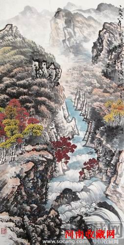 本期图录封面作品为岭南画派二代代表人物关山月作品《晴峦秋意浓》。这件作品作于1996年,是关山月晚年艺术风格趋于成熟期的代表作品。关山月的作品在这一时期进一步从传统中吸取了更多营养,增加了笔墨意趣、意境等在作品中的成分。1994年关山月进行了秦岭、黄河壶口瀑布的写生创作,并为全国政协礼堂创作《黄河魂》。北方山水倾泻而出的张力和气势对关山月的影响体现在作品中便是用笔的泼辣、奔放、恣肆。《晴峦秋意浓》中激流丛峭崖奔涌而下,被山石阻挡激起浪花层层。近景山石用浓墨重染,衬以红黄秋叶,一派秋高气爽之景。远景以淡墨层层推远,笔墨更为精妙,意蕴更为幽深。细部耐人寻味,整体气势恢弘,有较强的感染力,因空间由近至远跨度较大,画面冲击力异常强烈,可谓神完气足,是一件不可多得的气势宏伟、笔墨精练的关氏晚年佳作。