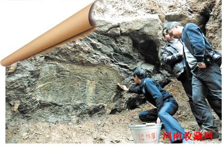 因养殖大鲵施工,湖南怀化辰溪发掘尘封300多年的大酉洞后洞(详见本报3月7日A10版报道《尘封300多年后大酉古藏书洞后洞现世》)。昨日,辰溪又传新消息,藏书洞口上方发现一块摩崖石刻,上刻斗大的“大酉洞”三字。通过辨认石刻左右三竖行小字落款,可初步断定为明朝嘉靖年间湖广布政司拜谒大酉洞后所刻,比前次发现年代更为久远。