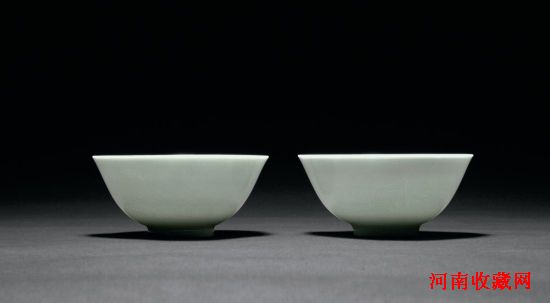 粉青釉锥花暗刻,为雍正朝唐英仿宋湖田窑品种。碗心暗花锥刻海浪翻滚,两只蝙蝠上下翻飞;外壁暗花装饰,通景福山寿海,九只蝙蝠飞翔天际,寓意九五之尊福寿万年。碗底青花双圈内楷书“大清雍正年制”六字二行款。