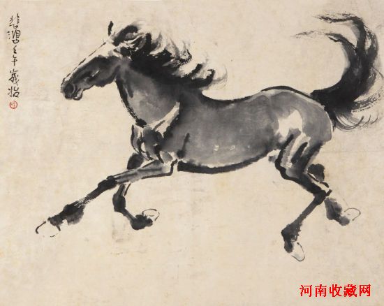 徐悲鸿在《徐悲鸿覆问学者的信》中强调:“我爱画动物,皆对实物用过极长时间的功,即以马论,速写稿不下千幅,并学过马的解剖,熟悉马之骨架,肌肉组织,然后详审其动态及神情,方能有得。”他早年在欧洲学习的科学求实精神上,严谨地掌握了马的动态、结构、习性,经过千锤百炼,成功解决了笔墨和马的块面结构如何和谐一致的问题,得心应手地塑造出马的形象。而在1940年徐悲鸿访问印度后,游历了大吉岭克什米尔,看到了很多罕见的高头、长腿、宽胸、皮毛像缎子一样闪光的骏马,深为着迷,更逐渐了解马的剽悍、勇猛、驯良、耐劳、忠实的性格,同时又对骏马大量写生,所以他笔下的骏马益发斗志昂扬,意气风发。
