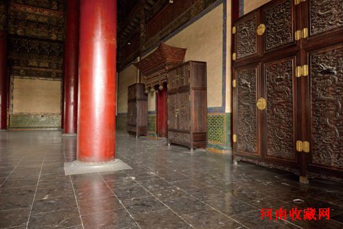 北京紫禁城中太和殿中陈设的一对紫檀云龙连山大四件柜和西夹室门旁的一对紫檀云龙纹大四件柜