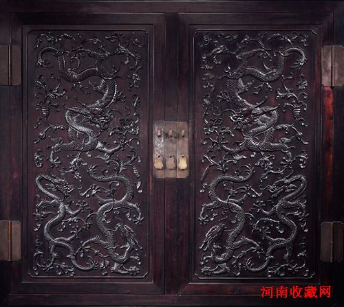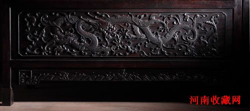 三、纹饰独特,雕刻极精。紫檀家具的做工与一般木材的做工不一样, 有“紫檀做工”之说, 即根据紫檀木的特性, 按照独特的工艺进行加工的一种方法。具体分两种形式。一种不加雕饰、光素结合, 紫檀木本身高贵的质地、色泽、纹理及成器后给人浑圆、厚重、静穆的感受。另外一种, 特别是进人清朝乾隆、嘉庆以后, 为了尽显大清帝国的富裕奢华, 利用紫檀木坚重细密、油性重、色泽一致的可塑天性精雕细刻,当时皇家造办处集中全国手艺高超的广州、苏州等地工匠,制作了一批艺术水准极高的紫檀雕饰家具。现在所看到的这对顶箱大柜显著的特点是典型的铲地高浮雕,是乾隆时期家具巅峰工艺的代表。作为铲地高浮雕,基础是铲地,这在紫檀活里面来说具有极大挑战性,铲地时用心和用力必须一致,才能达到打磨后平如镜面的效果。这对大柜的高浮雕技艺非常高明,龙纹和缠枝西番莲的雕饰都非常圆润,层次丰富,立体感极强,从侧面看甚至有圆雕的效果。