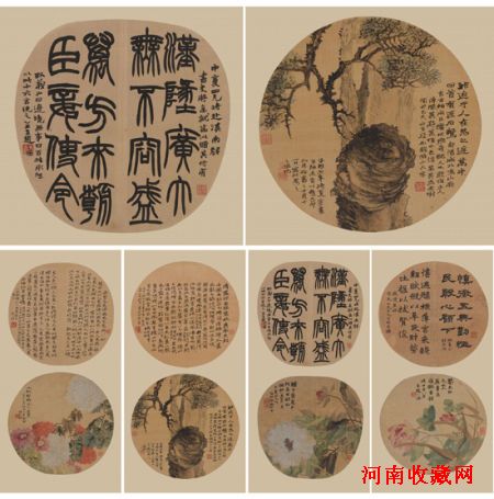 《纨扇书画四条屏》分别为三十六岁、三十七岁、五十一岁和五十五岁所创作,书法四帧分别为三十六岁创作的隶书、魏碑临书,三十七岁创作的篆书,五十一岁创作的行书宋人绝句,五十五岁创作的行楷自作诗,从变革期到人书俱老,从隶书、篆书到晚年的行楷书,既可窥其书法历程,也可观其文艺,风格渐进,内容丰富。其绘画四帧为芙蓉、芍药、古柏、丛菊,是其擅长的花卉、古木,最可体现其没骨绘画的功底,以及金石绘画的独到画风。